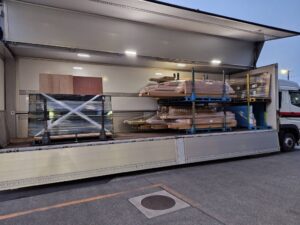 写真のように、製品は専用のパレットに積載され、安全性と品質保持を最優先に、丁寧な積み付けを行っています。